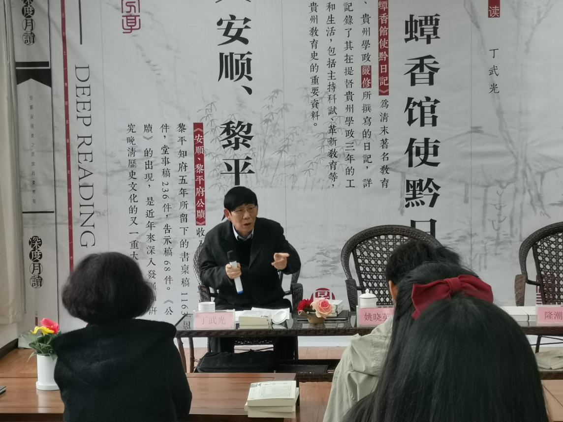首场分享荐读专家是贵州省红楼梦研究会会长,安顺本土文化名人丁武光老师,在对《蟫香馆使黔日记》和《安顺、 黎平府公牍》的读书认知和分享中,丁老师深入浅出的讲述让阅读爱好者们对这两本书籍有了新的认识。