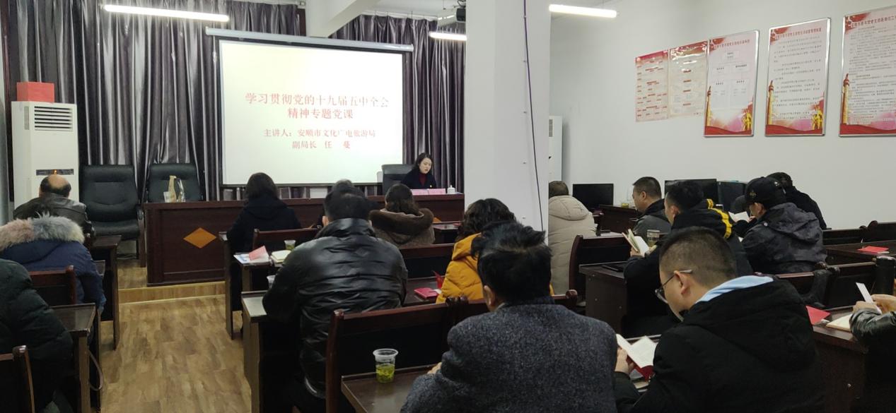 2020年12月23日上午,在安顺市图书馆党员活动室里,召开了一次有市图书馆、市文化馆、市黄果树艺术团全体党员参加的集中学习会议,邀请安顺市文广旅局党组成员、副局长任蔓给大家宣讲党的十九届五中全会精神。在宣讲过程中,任蔓同志从共同学习党章入手,通俗易懂地介绍党的十九届五中全会精神,号召党员干部要积极响应习近平总书记和党中央的号召,要模范遵守党章、切实践行党章,自觉把思想和行动统一到习近平总书记和党中央的决策部署上来。与会人员听了任蔓同志的宣讲后,纷纷表示:党的十九届五中全会精神为我们的工作指明了方向,我们坚决拥护,在今后的工作中,我们一定要增强“四个意识”,坚定“四个自信”,做到“两个维护”,为全市两个文明建设贡献力量。