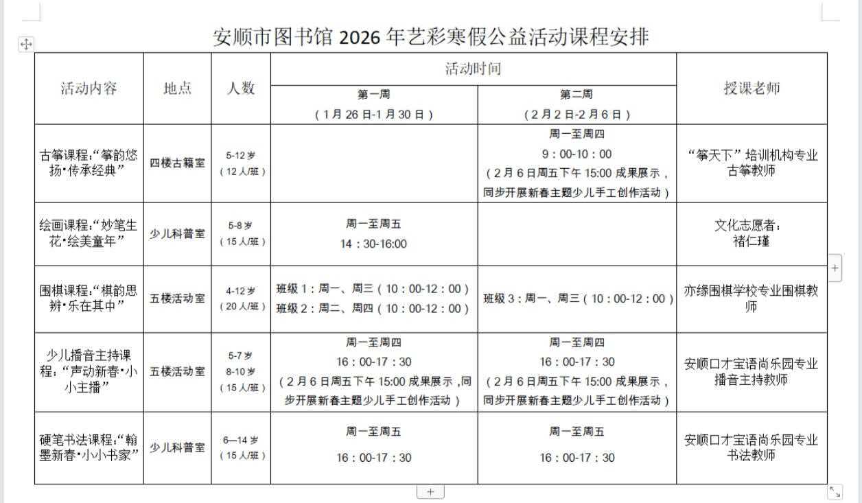 寒假来啦!这个冬天,安顺市图书馆为你准备了“悦在市图·艺彩寒假”系列公益课程,五大主题课程,专业老师指导,全部免费参与,感受传统文化的魅力,过一个“有艺思”的寒假!